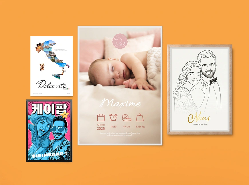 Créez un poster famille personnalisé qui met en lumière vos plus beaux moments de vie. Instants du quotidien, photos de famille, rires partagés ou souvenirs marquants : composez une affiche unique qui raconte votre histoire et reflète vos liens les plus précieux.